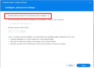 - During the setup process enable the option “Enable data checksum for advanced data integrity.